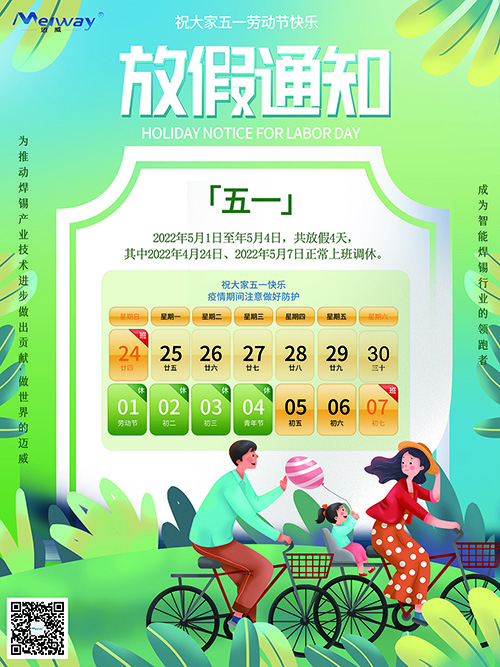 根據(jù)《國(guó)務(wù)院辦公廳關(guān)于2022年部分節(jié)假日安排的通知》,并結(jié)合公司實(shí)際情況,現(xiàn)將“五一”期間的放假安排,通知如下:
